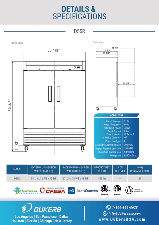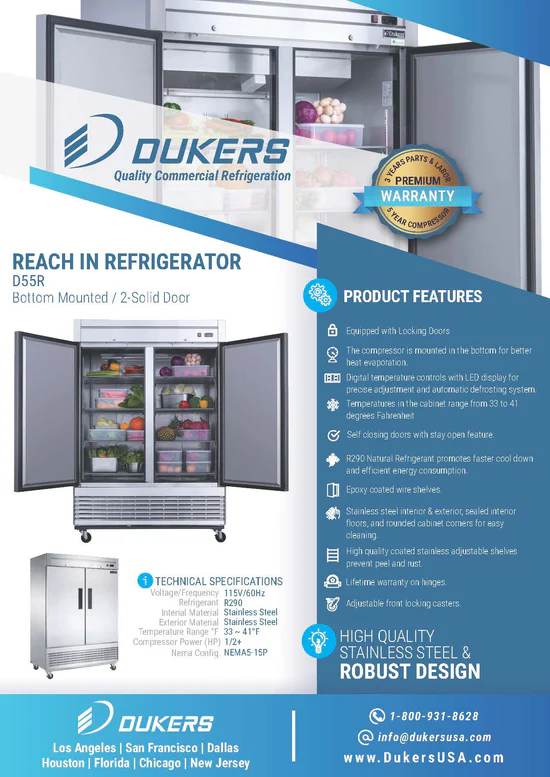 New Dukers 2-Door SS Refrigerator Cooler Bottom Mount D55R