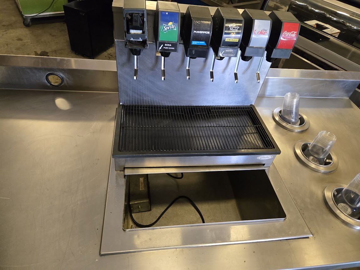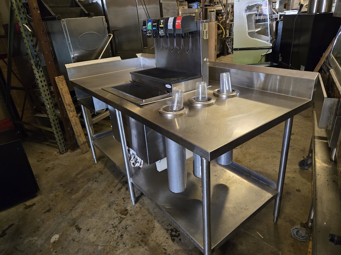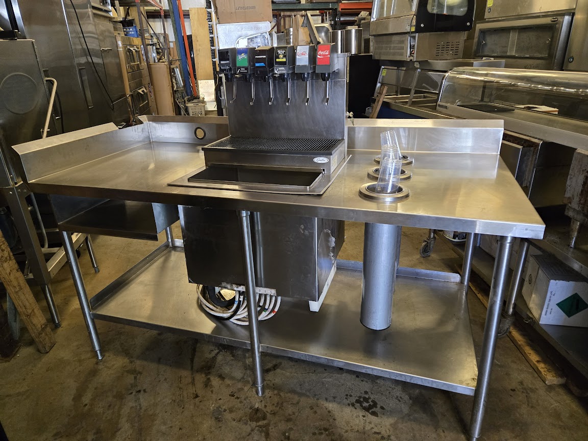 Pre-owned, priced at $1,200 a used 6 soda dispensers and 3 cup holders on the side for easy serving and left side ALL stainless-steel worktable!